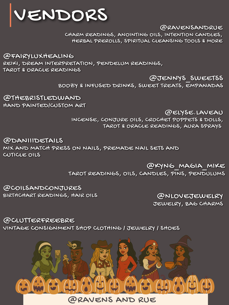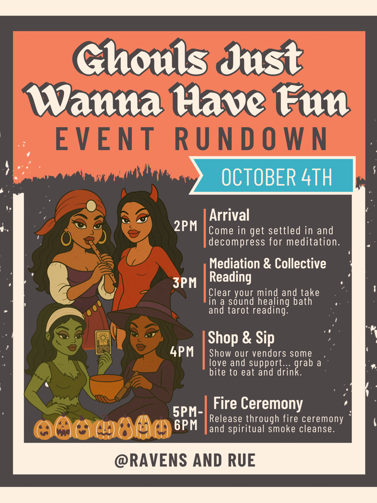 Join us for a magical afternoon where the vibes are spooky and sacred. Come dressed in your fiercest costume and tap into the spirit realm with your fellow ghouls. We'll be serving: